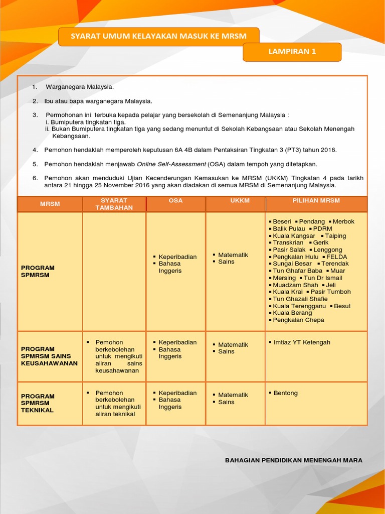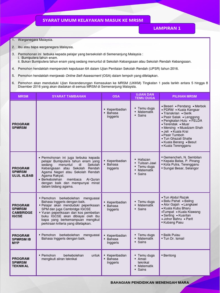 Syarat Kemasukan Mrsm Tingkatan 1 Semakan Kelayakan Mrsm Tingkatan 1 Pendidikanmalaysia Com