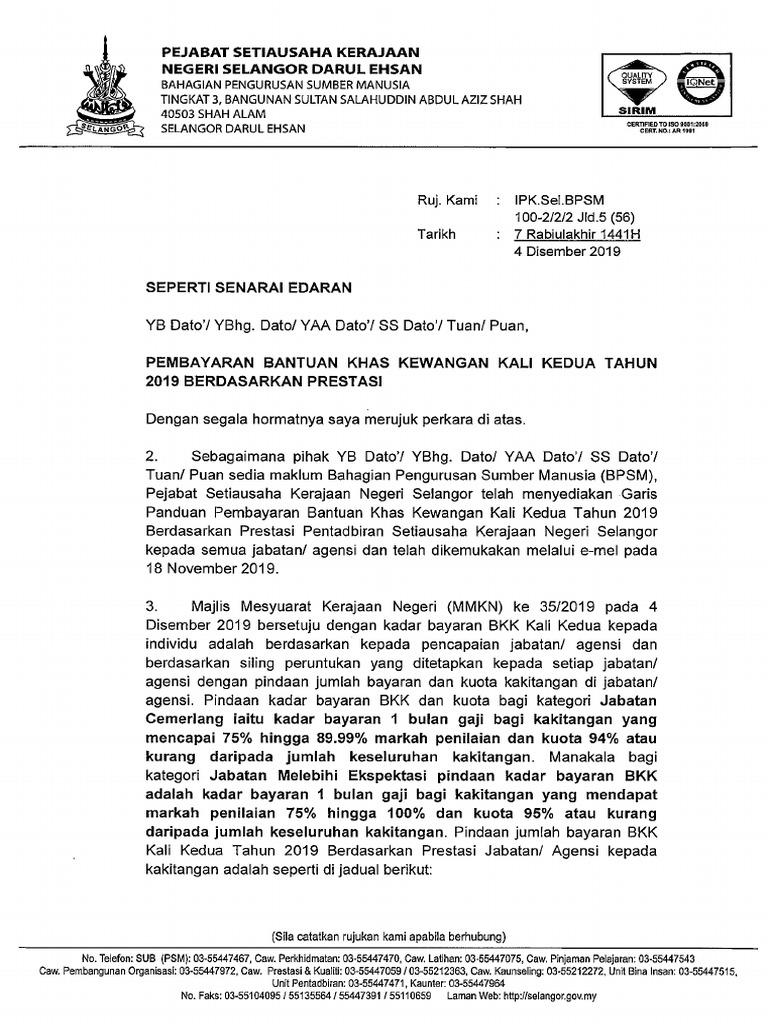 Surat Edaran Pembayaran Bantuan Khas Kewangan Kali Kedua Tahun 2019 Berdasarkan Prestasi