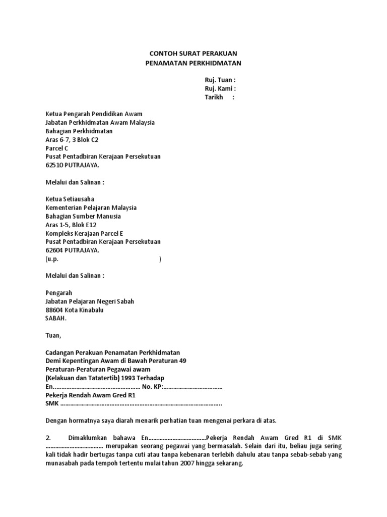 Contoh Surat Penamatan Perkhidmatan Staf Dalam Tempoh Percubaan 1