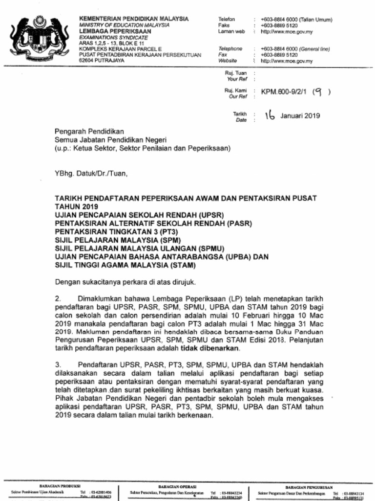 Surat Siaran Pendaftaran Peperiksaan Tahun 2019 Terkini