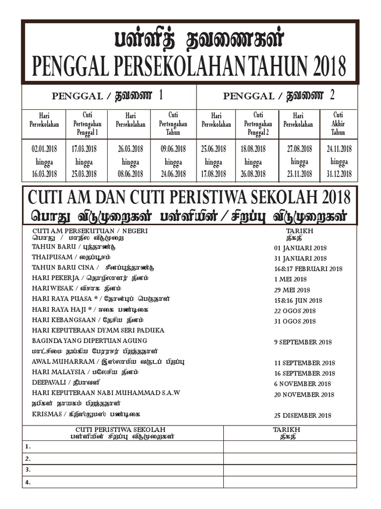 Penggal Persekolahan Dan Cuti Am 2018