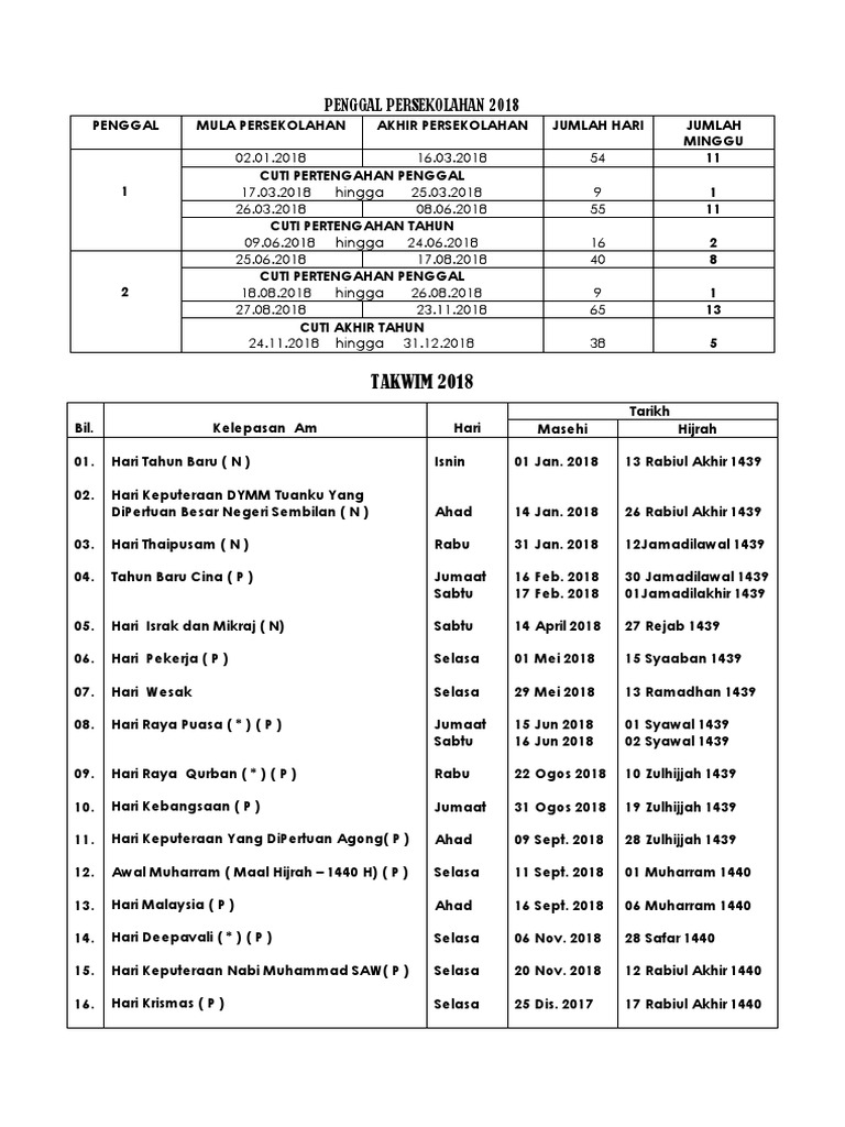 Penggal Persekolahan Dan Hari Kelepasan Am Tahun 2018