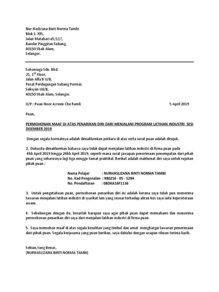 Contoh Kedua Surat Penarikan Diri N Mohon Maaf Pelajar Ke Firma
