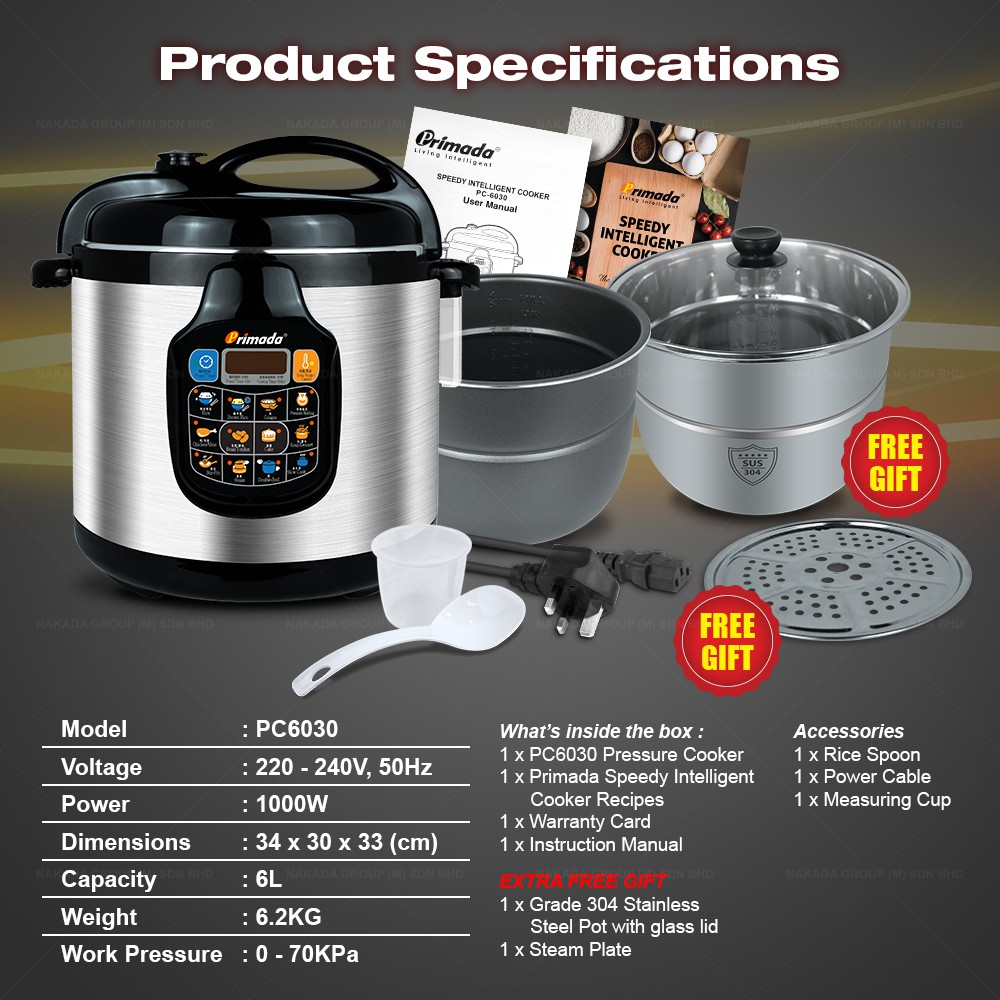 Primada 6 Liter Dual Pots Pressure Cooker Pc6030 1 Non Stick Pot Free 1 Stainless Steel Pot 1 Steam Rack 1 Mini Rice Cooker Lazada